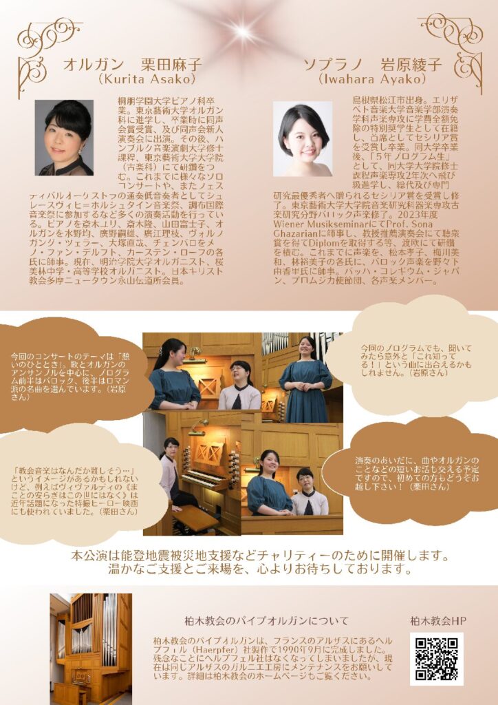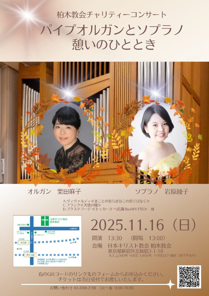 11月16日の午後1時半より、バロックとロマン派の名曲の数々を、全国各地の名高いコンサートホールでも演奏、活躍している栗田麻子さんによるパイプオルガン演奏と、バロック声楽で、熱烈なファンも多い、美しく艶やかなソプラノの岩原綾子さんによるジョイントコンサートです。
